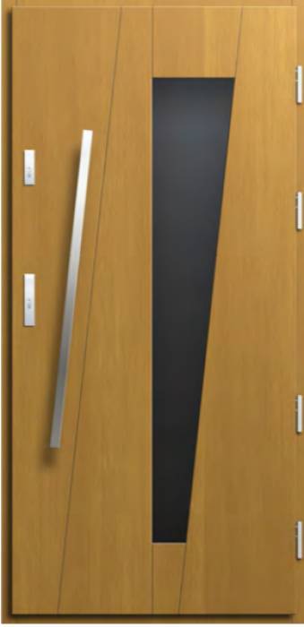 Urok drzwi zewnętrznych Future 16 kryje się w asymetrycznym ułożeniu przeszklenia oraz uchwytu w drzwiach. Równowagi w tym dodają wprowadzone dodatkowo pionowe linie, które dopasowują swój kierunek zarówno do szyby w drzwiach, jak i lekko przechylonego uchwytu.